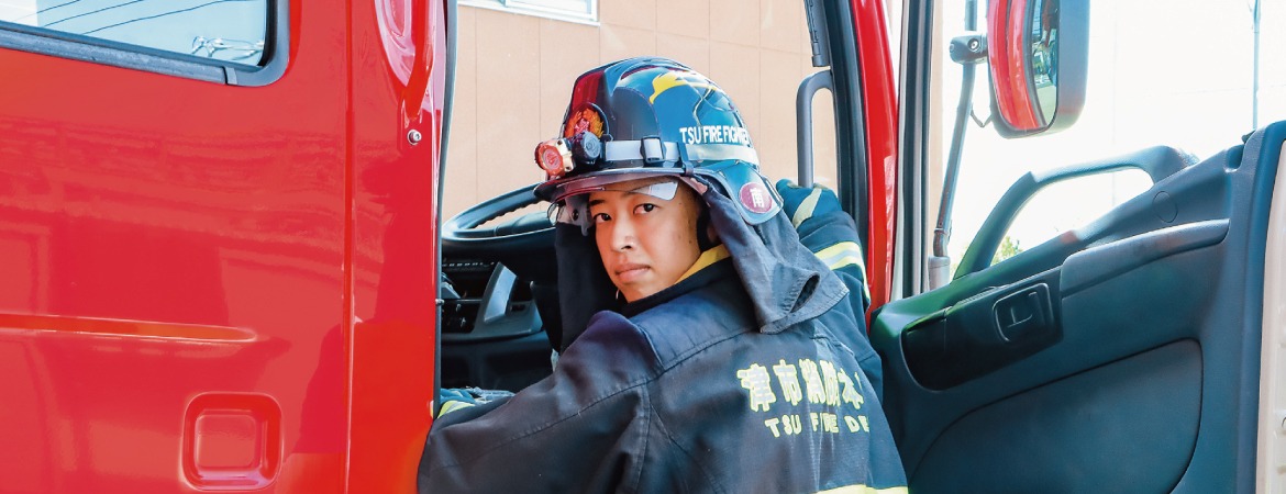 現在は、津市の消防・救急隊員として火災や救急の現場に出動しています。出動のないときでも、市民の安全、安心を守るために日々訓練やトレーニングに励んでいます。一分一秒をあらそう現場で、助けを待っている人を自分の手で助ける事が出来ることに大きなやりがいを感じています。